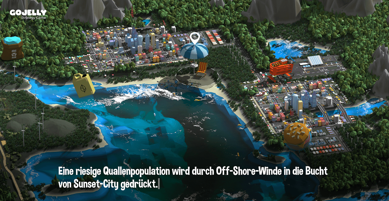 Die Spieler:innen schlüpfen in die Rolle des Bürgermeisters von Sunset City , einer fiktiven Küstenmetropole, die zunehmend von einer massiven Vermehrung von Quallen betroffen ist. Gemeinsam mit einem interdisziplinären Forscherteam gilt es, Ursachen zu analysieren, langfristige Strategien zu entwickeln und akute Maßnahmen zu ergreifen, um die Ausbreitung einzudämmen. Dabei müssen wirtschaftliche Entscheidungen, ökologische Verantwortung und die Bedürfnisse der Bewohner:innen ausgewogen berücksichtigt werden. Das Spiel schafft so einen realitätsnahen Einblick in die Herausforderungen eines sich wandelnden Ökosystems und zeigt auf, wie komplex nachhaltige Lösungsansätze in der Praxis sein können.