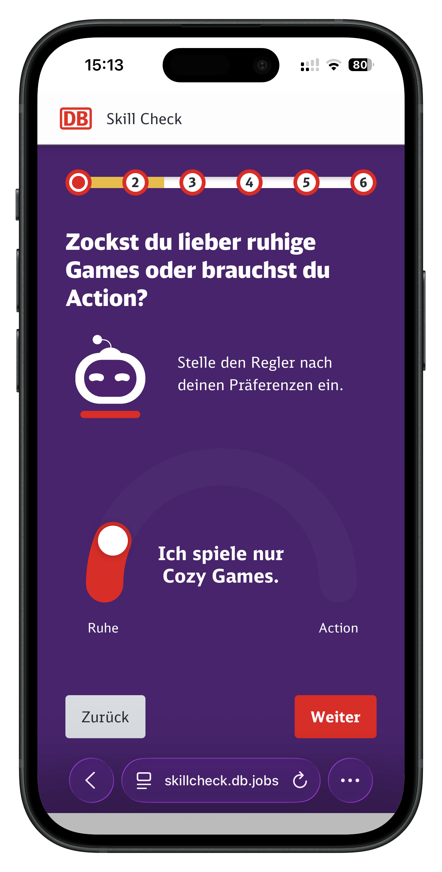 Für die Deutsche Bahn hat Naymspace den SkillCheck entwickelt – ein interaktives Online-Tool, das jungen Menschen hilft, spielerisch ihre Stärken zu entdecken und passende Ausbildungsberufe im DB-Konzern zu finden.