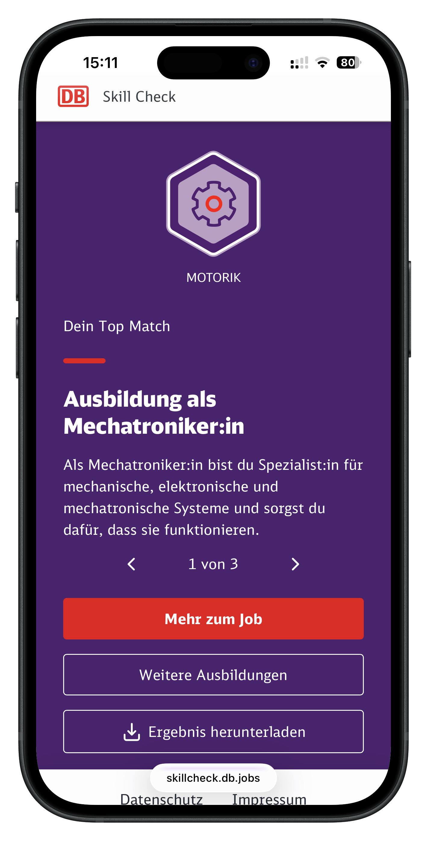 So entstand ein niedrigschwelliges, motivierendes Angebot, das junge Menschen nicht nur abholt, sondern ihnen echte Orientierung bietet. Das Ergebnis ist ein digitales Tool, das Jugendliche sicher zu passenden Ausbildungswegen innerhalb der Deutschen Bahn begleitet und gleichzeitig die gesamte Azubikampagne wirkungsvoll unterstützt und stärkt.